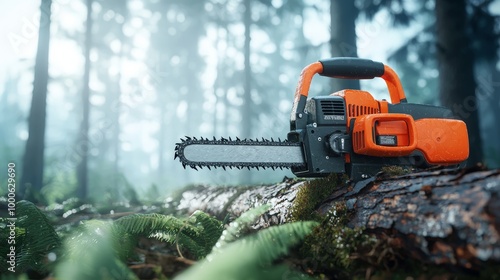 © Sariyono, Fototapeta premium Chainsaw on Log in a Misty Forest Setting
