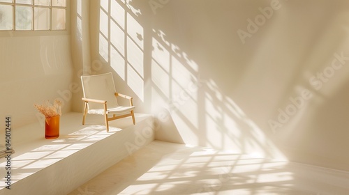 © antkevyv, Obraz premium Chair in room with window vase with flowers on floor next to chair concept simple interior, calm still flower