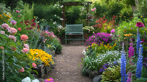 Naklejka premium chair in the garden framed from flower beds
