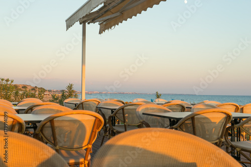 © lakkot, Fototapeta premium chairs and tables on a beach restaurant during sunset