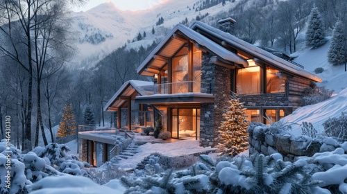 © Vlad, Fototapeta premium Chalet Chic: Luxurious 3D Rendering of a Modern Alpine Home and Landscape at Night