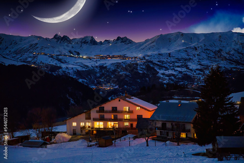 © Gatan, Fototapeta premium Chalet de montagne de nuit
