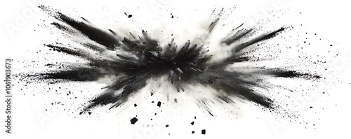 © Zia, Obraz premium Chalk Dust Explosion: An effect showing black chalk pieces and powder flying in an explosion on a white background.
