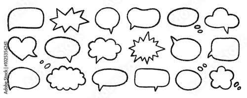 © AnyaLi, Fototapeta premium Chalk pencil speech bubbles doodle set. Crayon communication frame, comic talk balloon in sketch style, Grunge texture. Hand drawn vector illustration isolated on white background