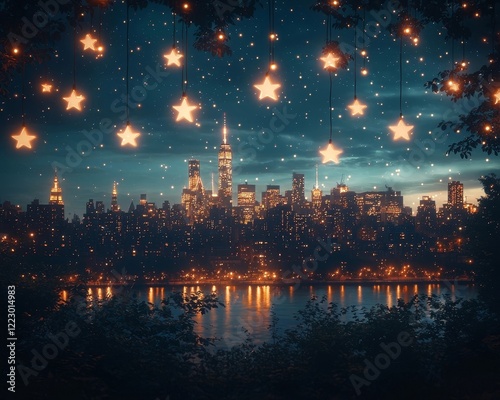 © Thares2020, Fototapeta premium Chalkboard Cityscape at Night with Glowing Skyscrapers and Twinkling Stars in the Sky