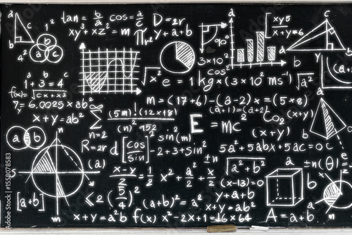 © jittawit.21, Fototapeta premium Chalkboard filled with complex mathematical formulas, graphs, geometry shapes and scientific equations