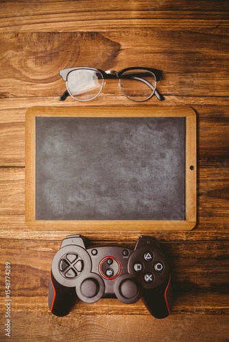 Fototapeta premium Chalkboard is lying on warm wood planks, in flat illustration with eyeglasses and game controller