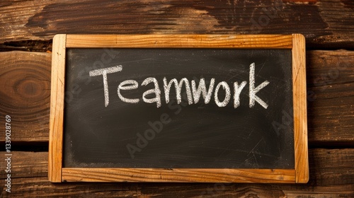 © Katawut, Fototapeta premium Chalkboard with Teamwork written on it against rustic wooden background