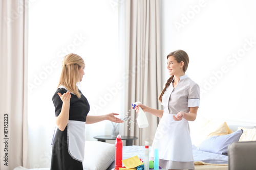 © Africa Studio, Fototapeta premium Chambermaid in uniform teaching trainee indoors