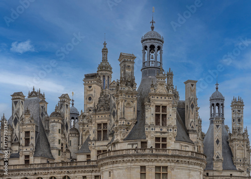 © Franck Legros, Naklejka premium Chambord, France - 10 27 2025: Detail view of the Chambord Castle roof with balconies, towers, bell towers and chimneys