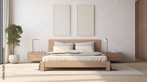Fototapeta premium Chambre à coucher, plan sur un lit de couleurs claires et épurées, dans les...
