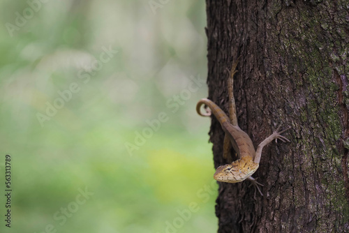 Fototapeta premium Chameleon, Changeable Lizard, Red-headed Lizard, Indian Garden Lizard (Calotes versicolor Daudin) on the tree by adjusting the focus on the face