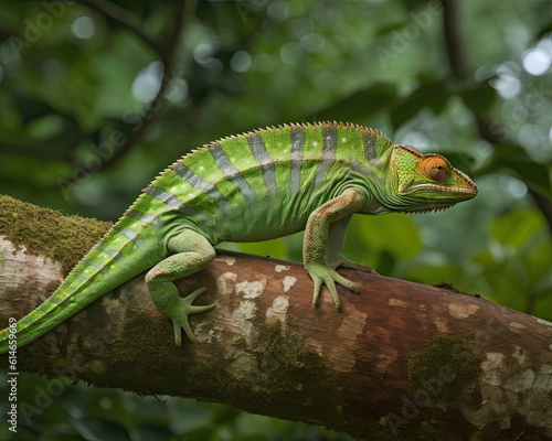 Obraz premium Chameleon Climbing Tree in Rainforest