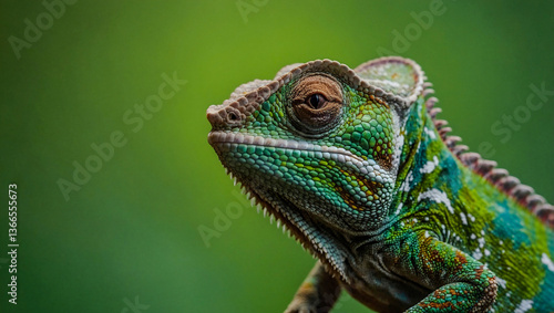© claudunia, Obraz premium Chameleon lizard on a green background.