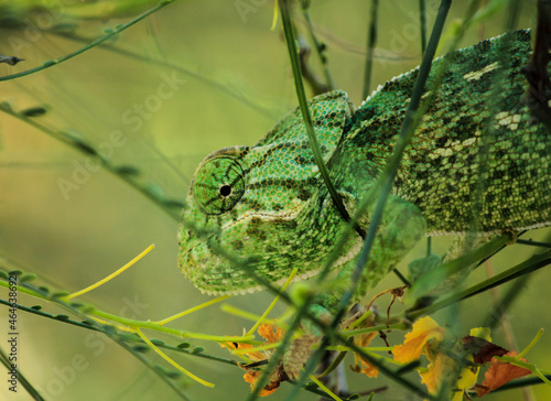 © SoniaBonet, Fototapeta premium Chameleon on a branch under the sun