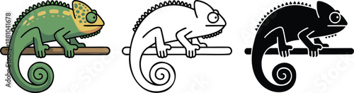 Fototapeta premium Chameleon perched on a branch silhouette & Outline and illustration set...