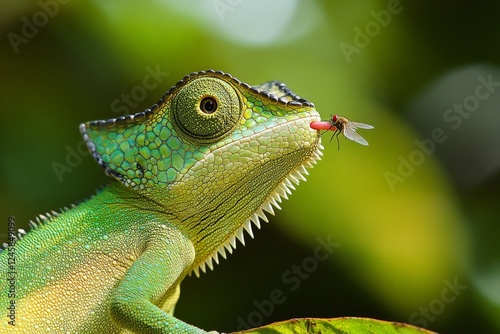 © ChaoticMind, Obraz premium Chameleon poised to catch a fly in a lush tropical environment during daylight hours
