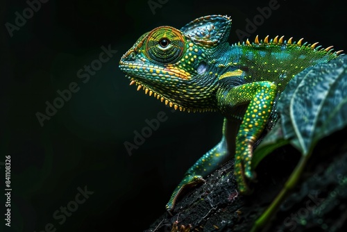 © SHOTPRIME STUDIO, Obraz premium Chameleon sitting on a tree branch looking at the camera in the wild nature