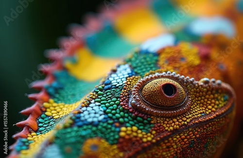 © Maryna, Fototapeta premium Chameleon skin texture. Close-up photo of reptile, multicolored scales, various shades. Vibrant colours generate abstract background. Eye detail with textured skin. AI generated digital art for