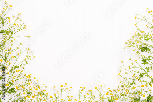 Obraz premium Chamomile flowers floral framee. Flat lay, top view.