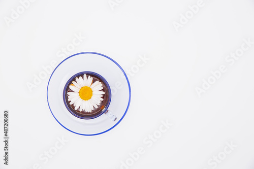 Fototapeta premium Chamomile tea drink. Chamomile flower in a cup of tea. Flower tea.