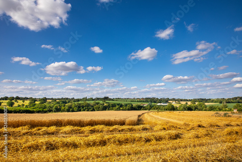 © Thierry RYO, Obraz premium Champ de blé doré et meule de paille après les moisson en été.