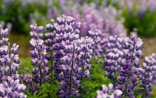 © Veronique, Fototapeta premium champ de fleur mauve sur un terrain vague en été lors d'une journée grise