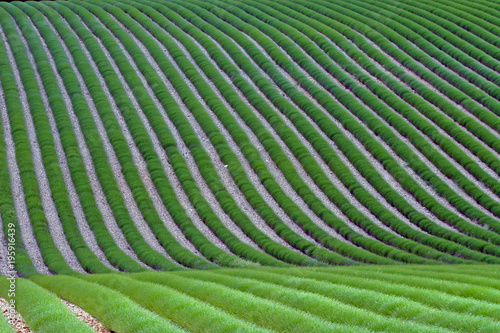 Fototapeta premium Champ de lavande verte avant floraison. La lavande forme des rubans végétaux...