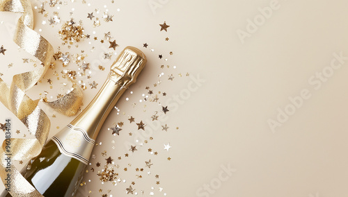 © iamfrk7, Fototapeta premium Champagne bottle with gold stars and glittering confetti on beige background, festive celebration flat lay, luxury party decor, elegant event concept, minimalistic holiday design