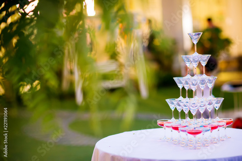 Fototapeta premium Champagne glass pyramid.pyramid of glasses of wine, champagne, tower of champagne's glass in wedding reception party