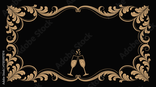 © Liudmila, Naklejka premium Champagne toast in gold ornate frame on black background
