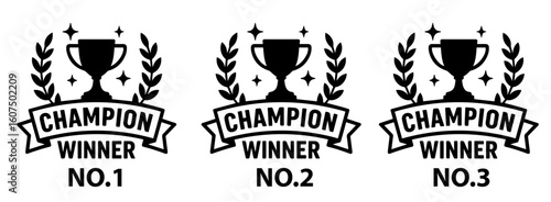 Fototapeta premium Champion Winner Trio Black Vector Set, Silhouettes of Victorious Poses with Trophies and Medals, Editable Formats: AI, EPS, JPG, PNG, Ideal for Both Digital and Print Use