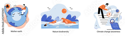 Naklejka premium Change climate awareness, saving planet, World Environment Day, global warming ecological problems. Mother Earth day, nature biodiversity metaphor set. Care for surroundings eco concept