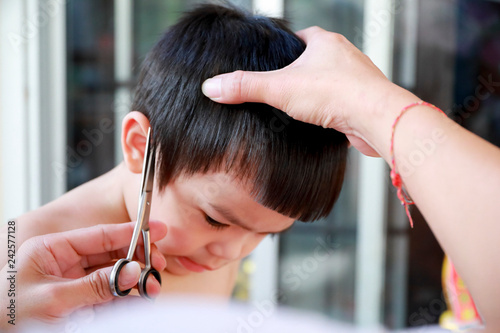 © nitimongkolchai, Naklejka premium change the face : little asian boy is getting haircut by hairdresser