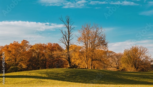 © vxnaghiyev, Naklejka premium Changing foliage on trees in early autumn, seasonal change