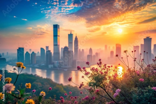 © Danicha, Fototapeta premium Changsha Skyline Silhouette at Dawn: Double Exposure Cityscape Stock Photo