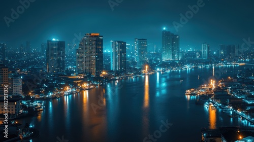 Naklejka premium Chao phraya river reflecting bangkok cityscape at night