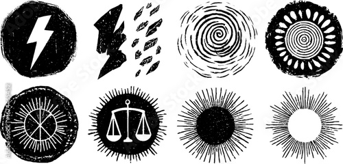 © Artem, Fototapeta premium Chaos versus order symbol set featuring abstract linocut and broken glass elements for artistic design