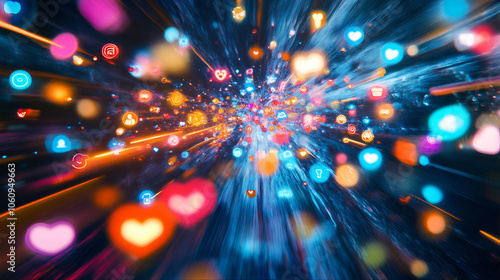 © Taiwo, Naklejka premium Chaotic social media chatbot burst, chatting media, social networking, digital technology, internet, information flow, ai data mining and fragmentation, multilevel marketing, quantum technology