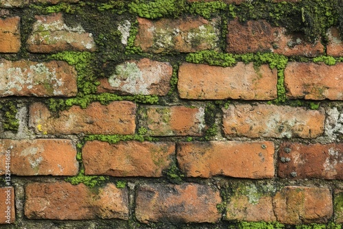 Obraz premium Chaotic Texture of an Old Brick Wall Adorned with Lush Green Moss