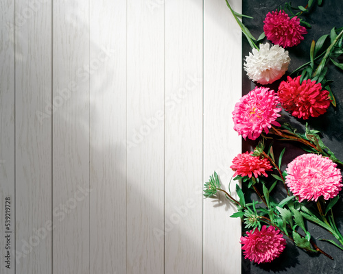 Naklejka premium Chaotically scattered aster flowers are on a dark rough background next to an empty white wooden table. Abstract floral autumn composition with copy space.