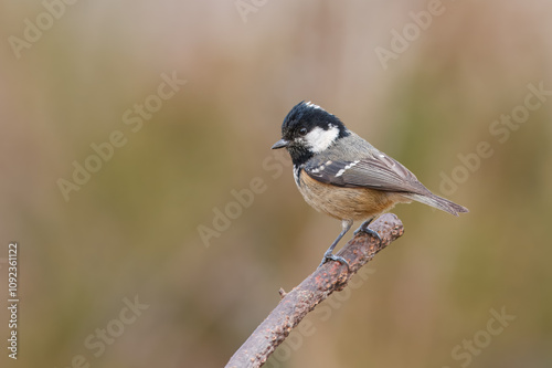 © Marco, Fototapeta premium Chapim-carvoeiro com o nome cientifico de (Periparus ater). Pequena ave cabeça preta e branca pousado num ramo.