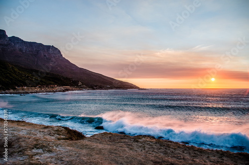 Naklejka premium Chapman's Peak Drive Through the Mountains in Cape Town at Sunset Next to the Sea with Crashing Waves in South Africa