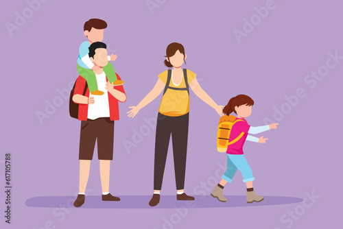 Fototapeta premium Character flat drawing hiking family with two children. Group of people with...