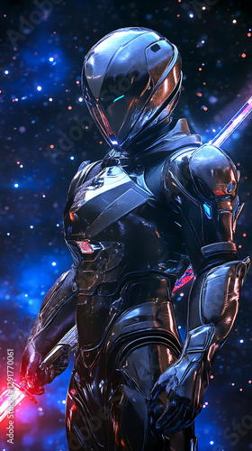 © AJI NUR FAJAR, Naklejka premium character with space fighter suit and laser sword on cosmic background