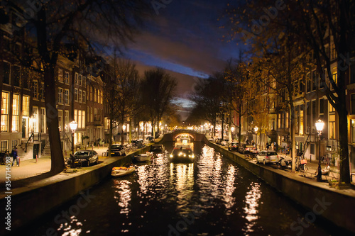 © Francesca, Fototapeta premium Characteristic view of a canal illuminated at dusk in Amsterdam city center. Netherlands, Holland, Europe.