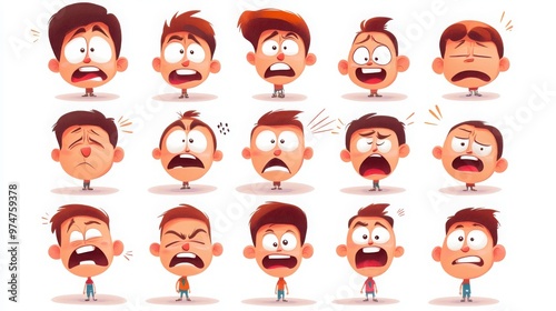 Fototapeta premium Characters in different emotional states such as worry, anger, and excitement, with clear expressions and simple, sharp lines, white background