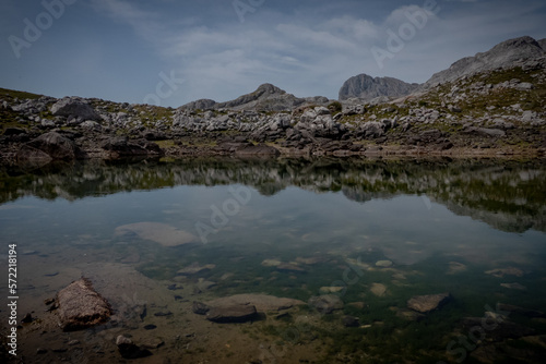 Fototapeta premium Charca protegida con reflejo de la montaña y mas montaña de fondo.