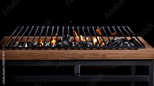 Naklejka premium Charcoal grill with burning coals and flames on a wooden frame.