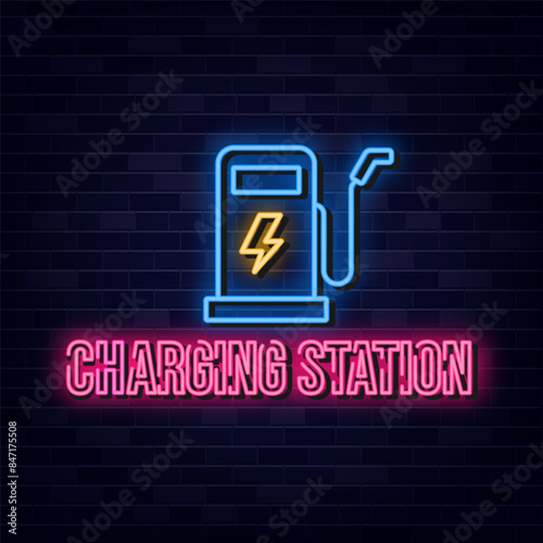 © noviyanita, Fototapeta premium Charging Station Neon Sign with Brick Wall Background